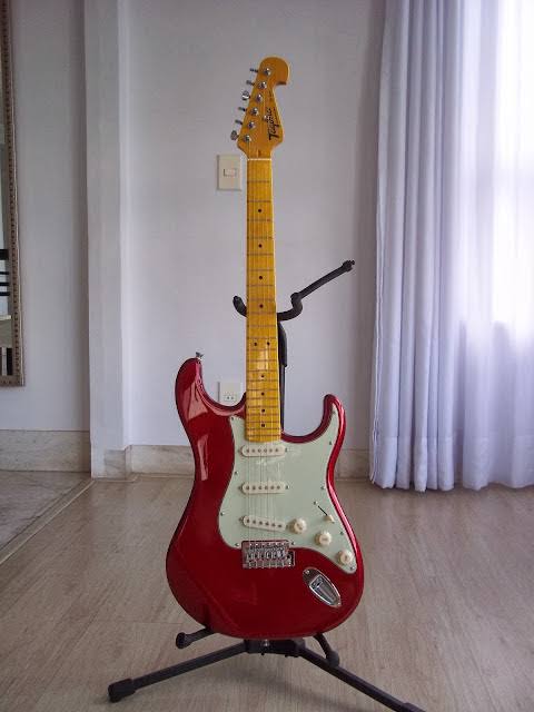 Guitarra vermelha de braço escuro