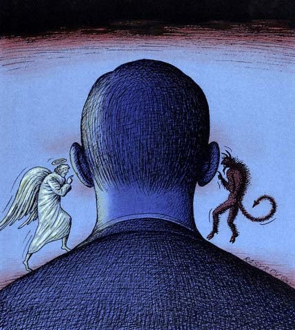 Eu penso muito, mas muito mesmo comigo mesmo, vivo avaliando situações dentro da minha cabeça e sempre existe duas opiniões sobre o ocorrido, uma que tenta achar uma solução e outra que resolve tudo no ódio. Vocês também tem esse confronto com vocês mesmos ou só q eu tenho essa divergência de ideias dentro da minha cabeça?