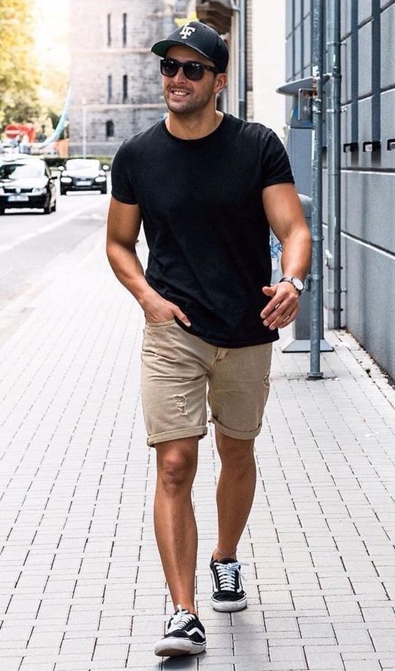 Camisa preta estampada, calça ou shorts, tenis, boné e moletom também ficam uns xuxus.