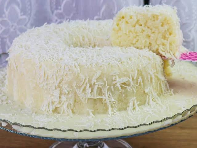 Bolo de tapioca bem gelado, de um um dia pro outro fica ainda mais gostoso... com coco e bastante leite condensado por cima.