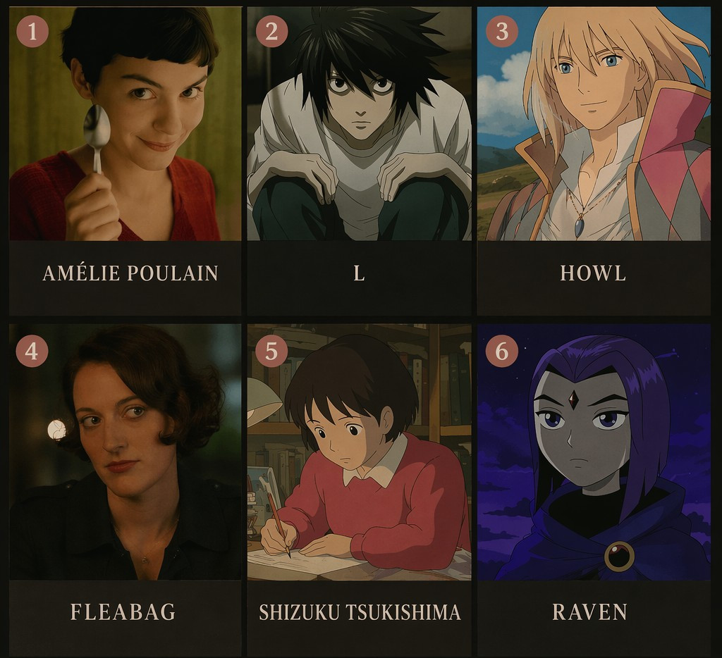 Com base nas nossas conversas, crie uma lista com 6 personagens de filmes e/ou desenhos que representem minha personalidade da vida profissional/pessoal.